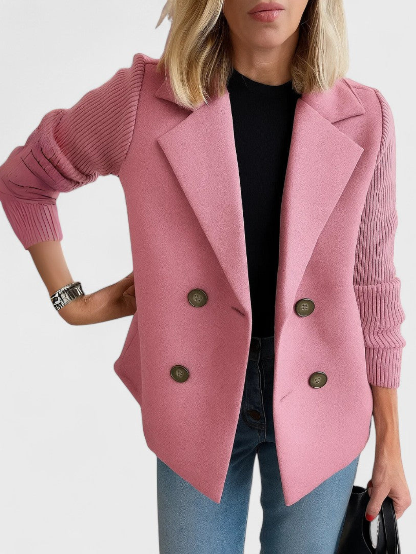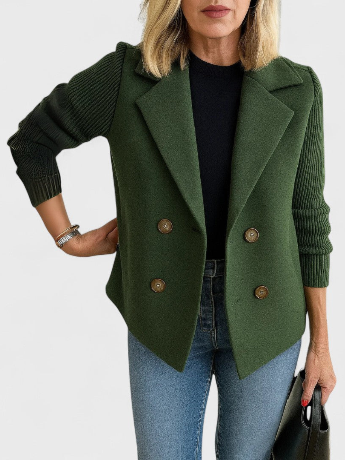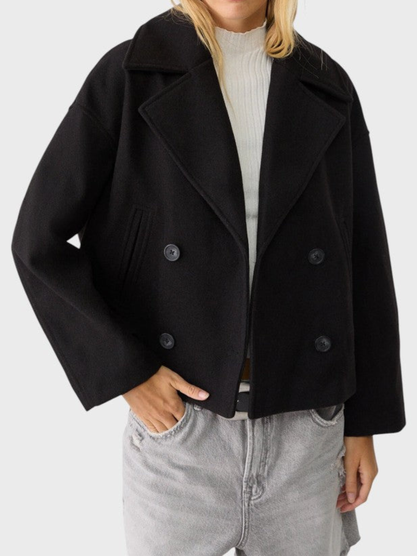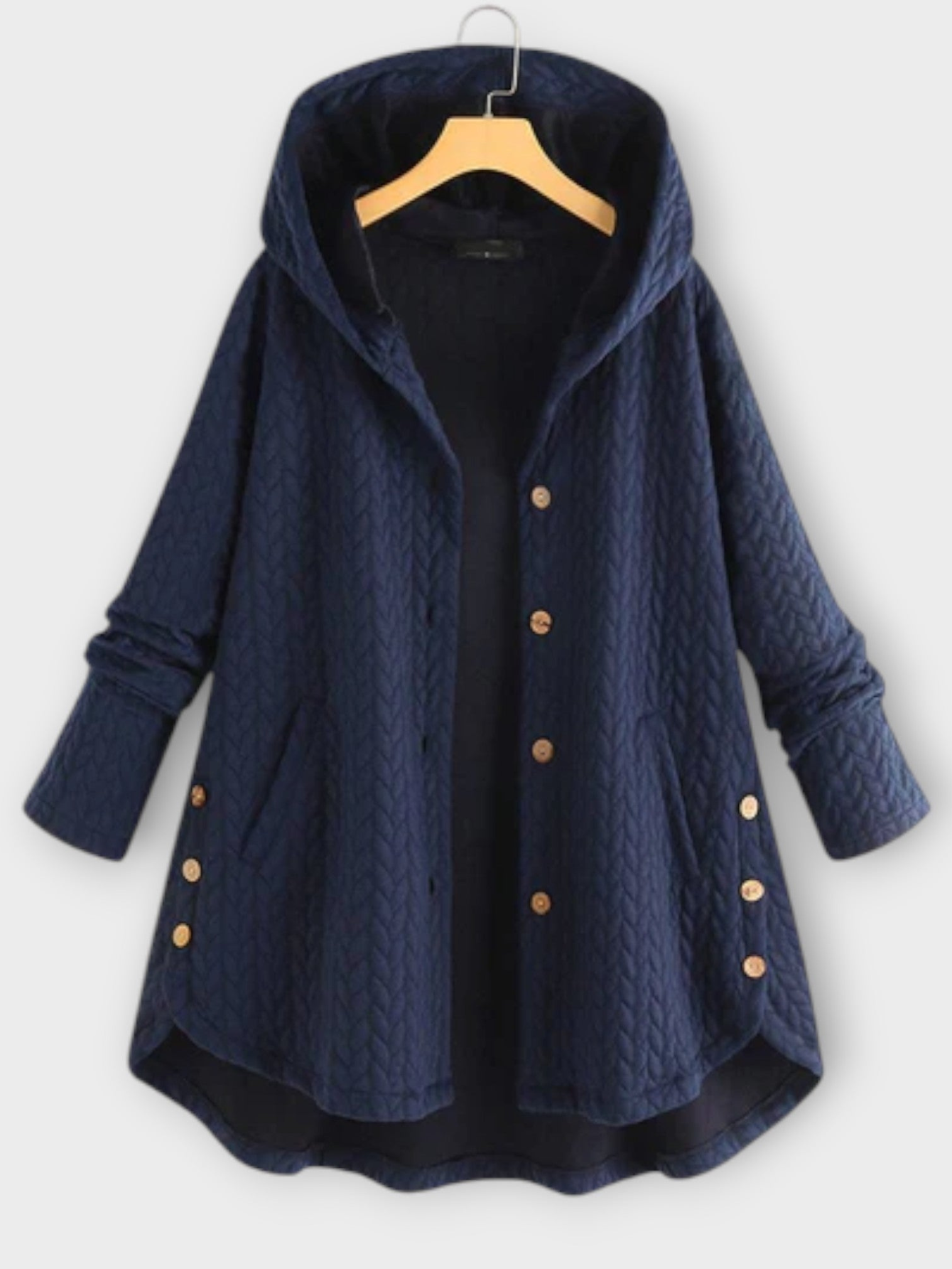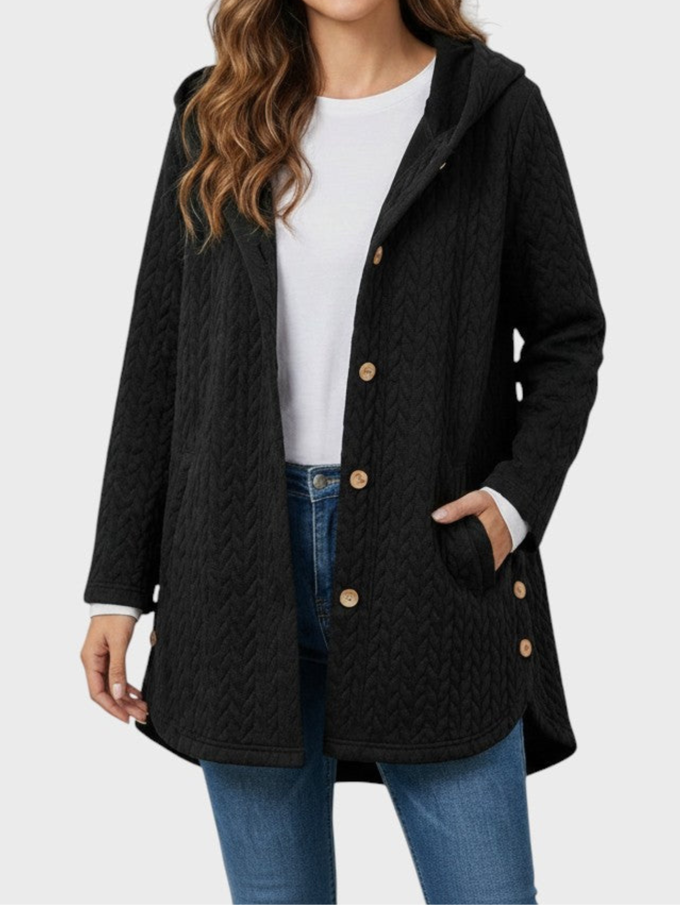 - Relaxed open-front design for effortless layering