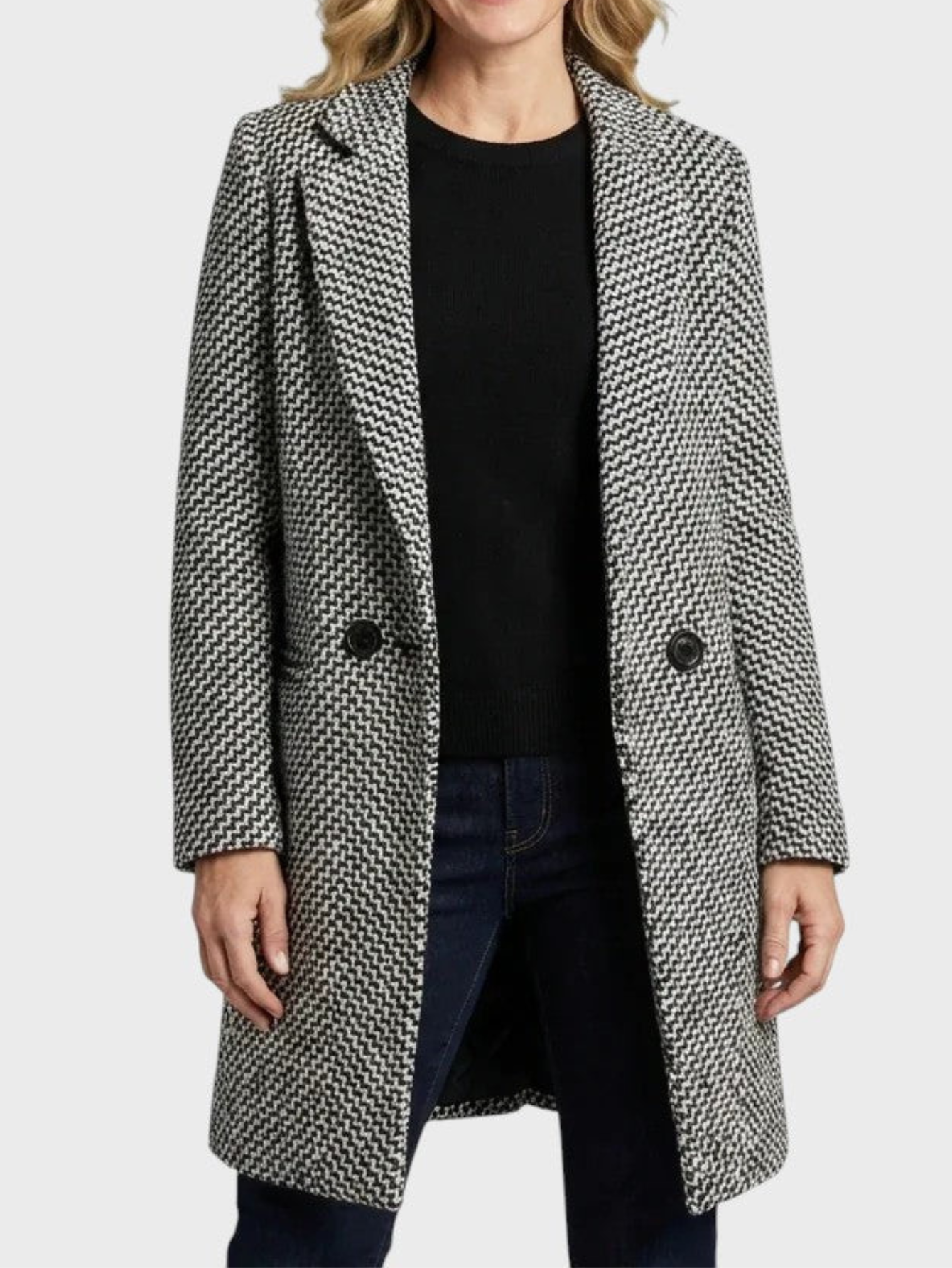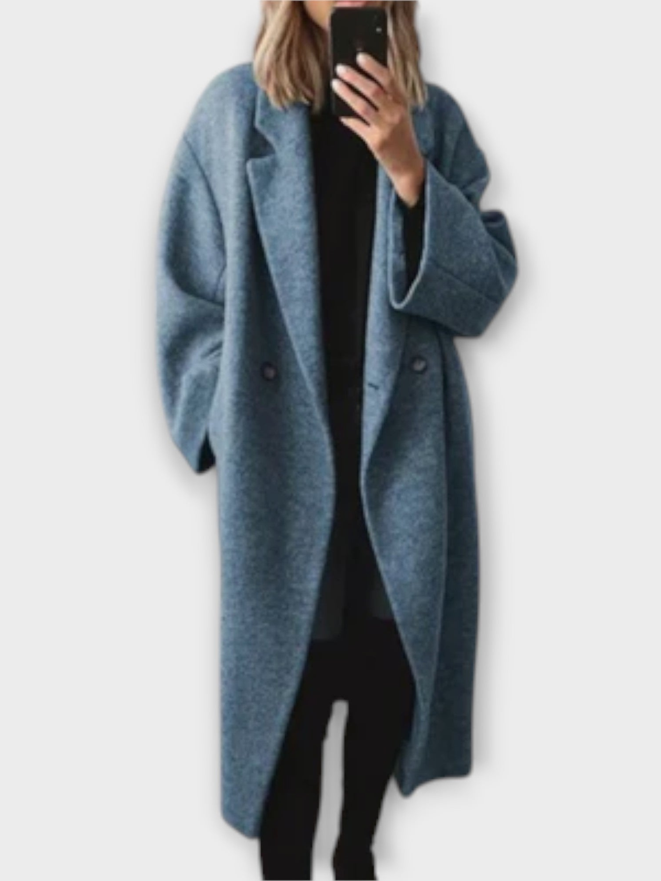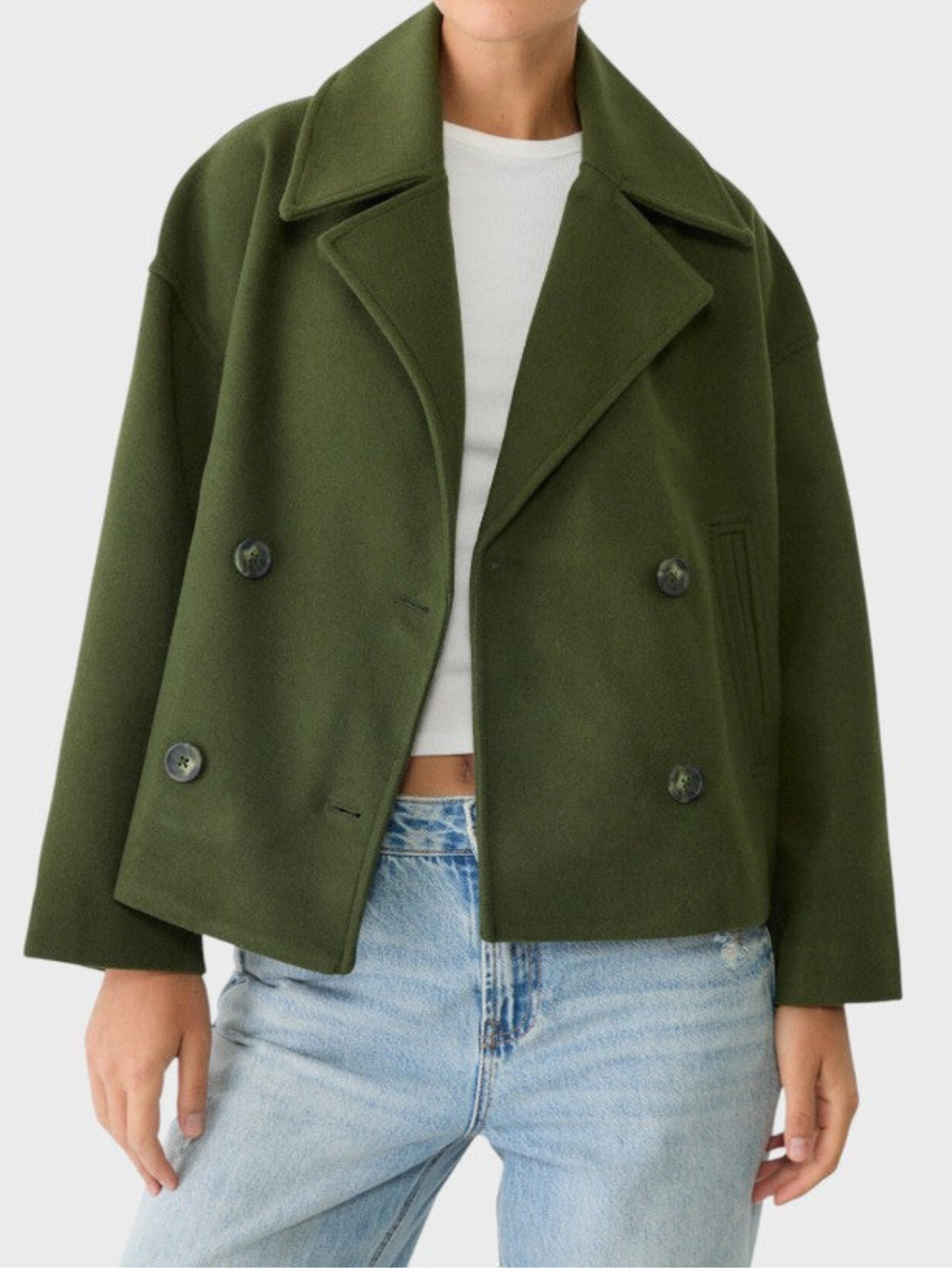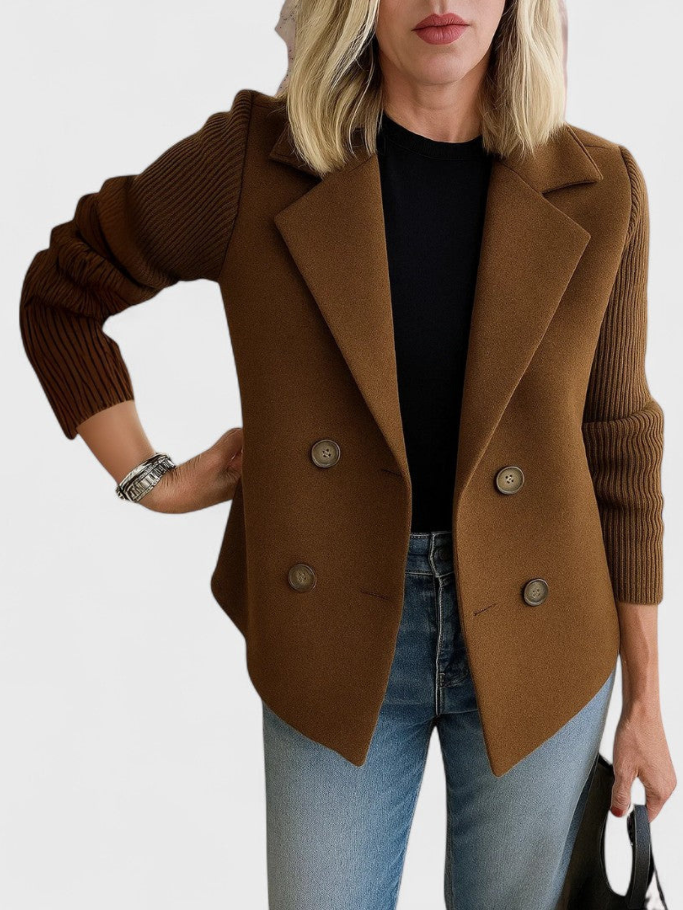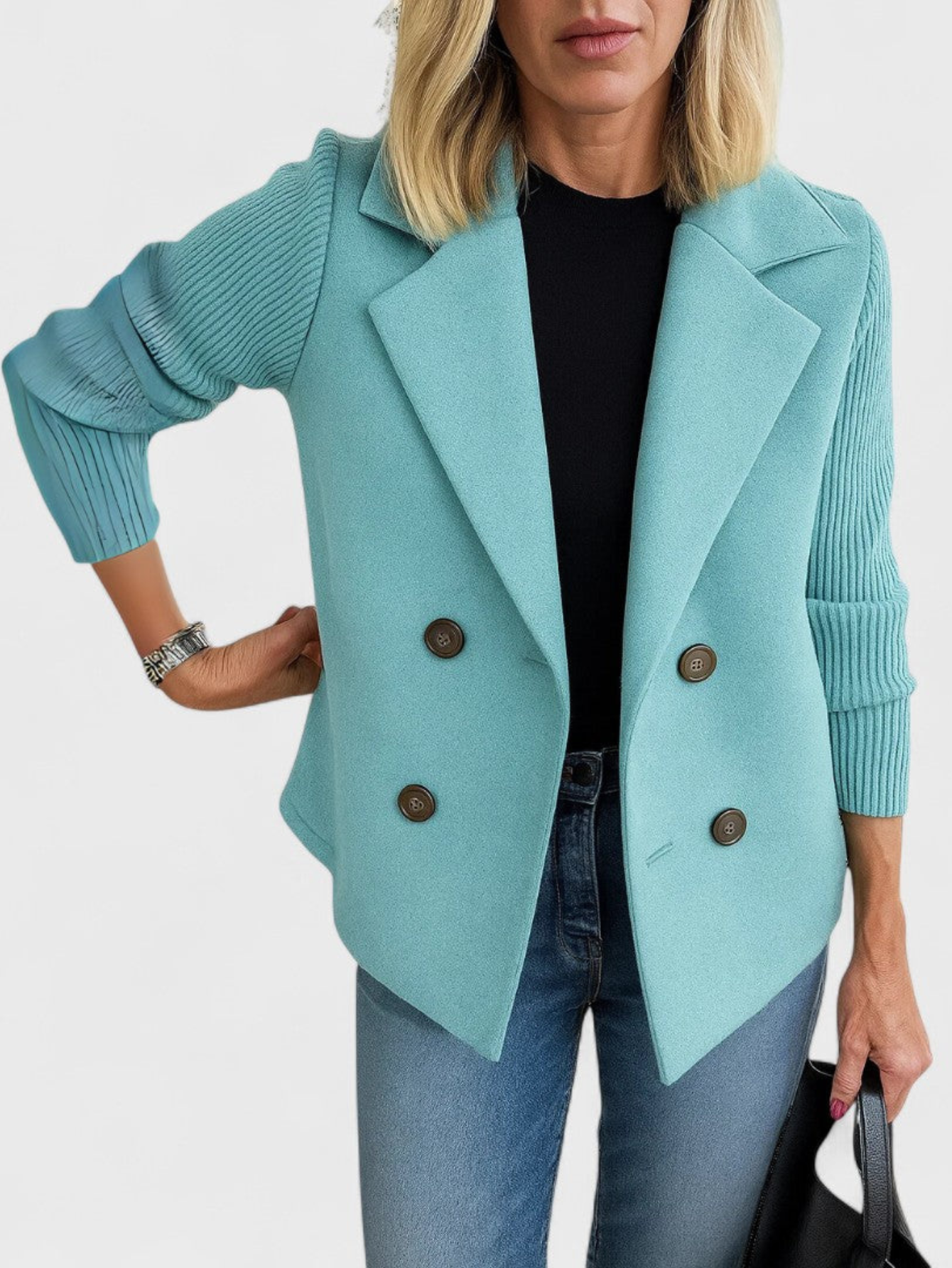- Relaxed open-front design for effortless layering